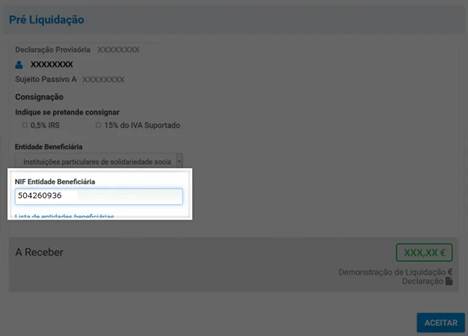 Caso tenha IRS automático, na área “Pré-Liquidação”, assinale a caixa que indica que pretende consignar 1% do seu IRS e inclua o NIF da instituição à sua escolha.