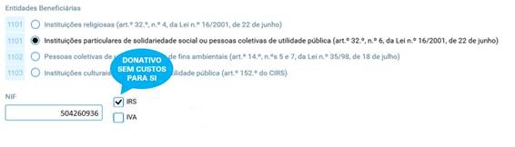 No Portal das Finanças, na opção “Entregar IRS” terá que entregar a declaração de rendimentos (Modelo 3); na secção Rosto, verá, do lado esquerdo, o quadro 11 e aí terá que selecionar o campo 1101 – selecionando a opção IRS e colocando o NIF da ASTA 504 260 936.